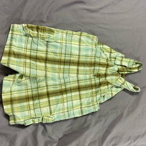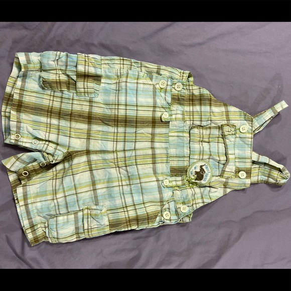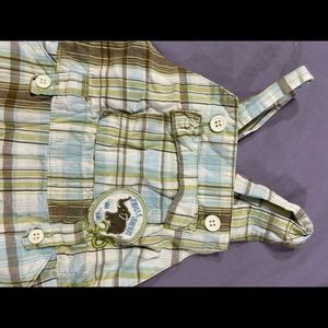 Blue, green, brown, and yellow plaid on a white background sun suit. Animal Safari patch on pocket.