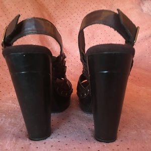 Braided faux leather, huarache style woven leather Gladiator Stiletto heels -- So chunky, so cute! They are a size too big for me, and I wear a 7; so I'm sure they're a size 7.5 to 8, though there is no size marking. I'd be happy to measure, if needed. Just in time for Holiday, Christmas or New Years Parties! Make these lovely strappy sandals yours today!!