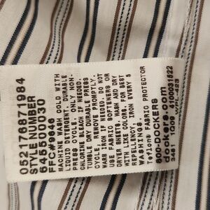 White with Navy blue and gold stripes Dockers no wrinkles stain defender short sleeve casual button-down shirt. Size XL, 17-17.5 neck. 60% Cotton, 40% Polyester. In great condition.