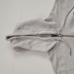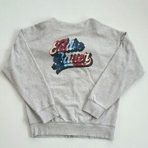 Gray with red, white and blue star logo on chest and back Eddie Bauer hoodie sweatshirt. Size Small. 58% Cotton, 38% Polyester, 4% Spandex. In excellent condition.