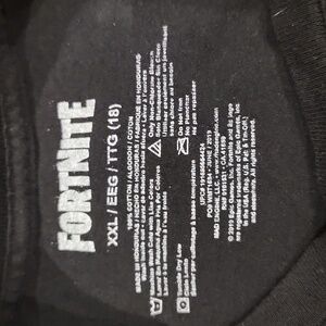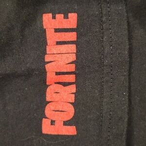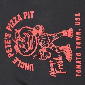 Black with red print Fortnite "Uncle Pete's Pizza Pit, Always Fresh, Tomato Town, USA" short sleeve T-shirt. Size XXL(18). 100% Cotton. In great condition.
