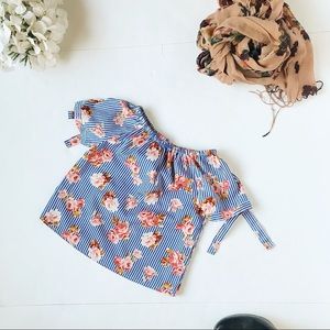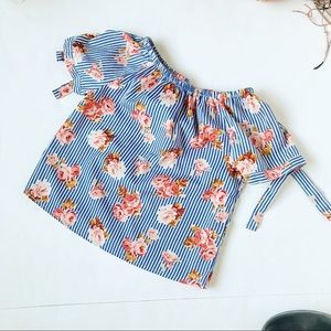 100% polyester. Off the shoulder style