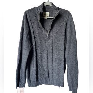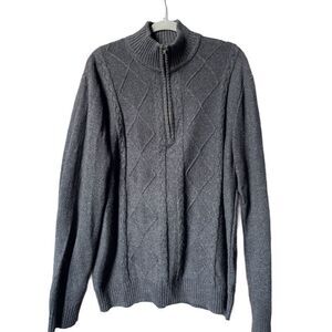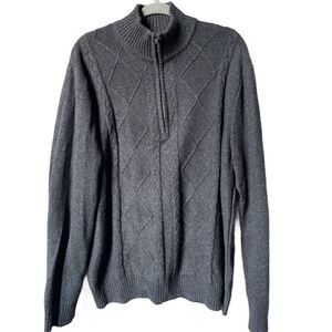 This sweater is in like new condition! Charcoal gray knit pullover sweater with 1/4 zipper on the chest. Diamond designs on the front and ribbed material on the bottom, ends of sleeves and high neck collar. Size XL. Perfect for Fall & Spring.