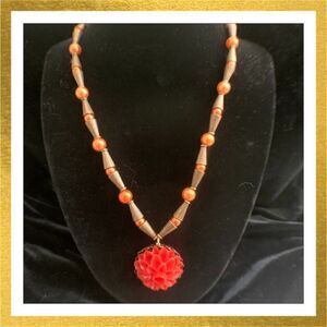 Make a statement with this one-of-a-kind upcycled necklace! Featuring a repurposed bottle cap pendant embellished with a resin flower cabochon and strung on a strand of gleaming copper beads and faux orange pearls, this necklace is the perfect mix of edgy and elegant. Add a touch of eco-friendly style to any outfit with this unique piece!