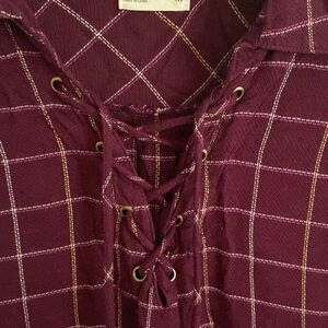 Harper long sleeve rayon tunic blouse in burgundy with crisscross striped pattern and eyelet ties at front neckline. In excellent condition!