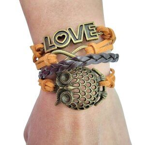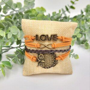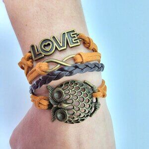 3/$20 Infinity Love Owl Charm Stack Bracelet Tan Brown Adjustable Jewelry Boho