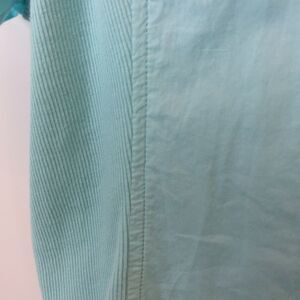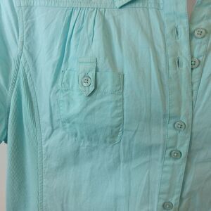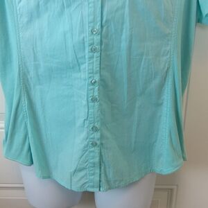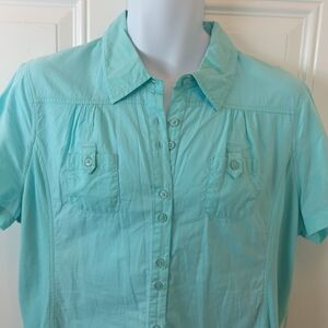 Kim Rogers light aqua short sleeve button front blouse, with two breast pockets, and, and stretchy side panels.