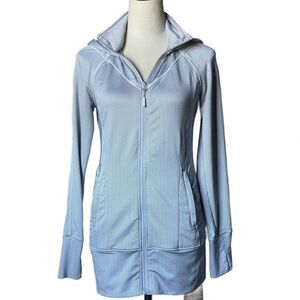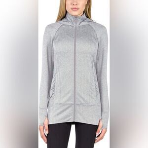 This full zip athletic top is gray and white with herringbone design. It is hooded with zipped pockets on each hip. It is long (A little over 27 inches) and has thumb holes at the end of the sleeves. Absolutely excellent condition! Good amount of stretch to the fabric.