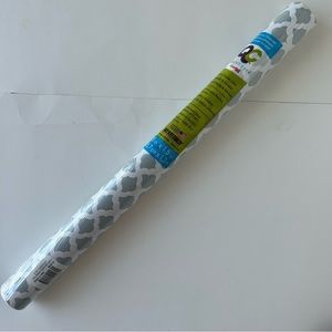 Self adhesive vinyl liners protect shelves and drawers while adding a touch of style. Simply cut with scissors to the desired size, remove the paper backing, and adhere to the shelf or drawer. Liners are stain-resistant and washable and are adorned with a lovely gray and white Moroccan pattern. Ideal for kitchens, bathrooms, and linen closets.