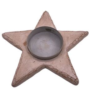This star candle holder is made out of wood. It has some purposeful distressed looks to the wood, but there are some flaws and discolorations. I think it still looks great. It will come with one large candle. I love this home decor.