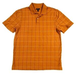 Orange square print Van Heusen short sleeve polo dress shirt. 58% Cotton, 42% Polyester. Size Medium. In excellent condition.
