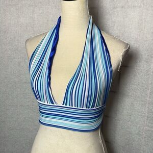 Stylish Y2K inspired halter crop top with blue and white stripes. Perfect for festivals, the beach, the pool, vacation, day trips, the lake, for summer and so much more. This is a top to have fun with!! Satin interior. Missing size tag, but it fits like a medium and the straps are adjustable on the back.