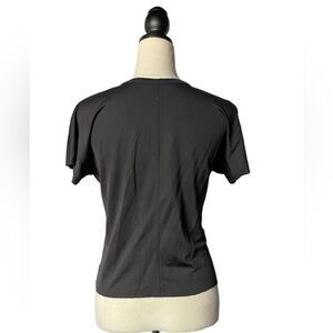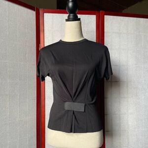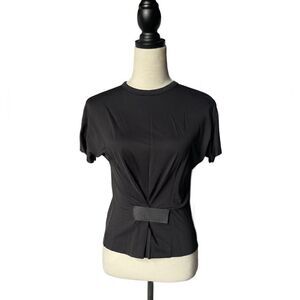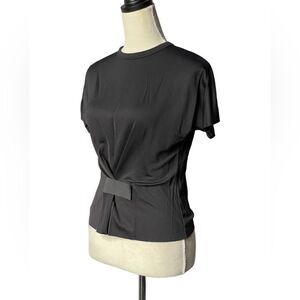 Black short sleeve crew neck blouse made of stretchy nylon-like material. The strap on the front will give you a cinched waist look. Small pull in the fabric, which is shown in photo, but excellent overall conditions