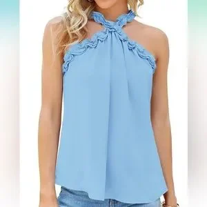 3/$20 cross cross halter neck flowy top. Sleeveless sky blue chiffon. Light weight. In great condition. Worn once. Frilly neck line. Size small.