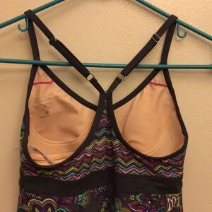 Beautiful pattern! 80% nylon 20% spandex. Lining 100% polyester. Has built in bra. Adjustable straps also. Feels like a bathing suit is the best way to describe it. I’m sure you could wear it to the pool or the beach or just plain “athleisure “ however you decide you will look and feel awesome! I love this and I know Athleta is great quality and style.