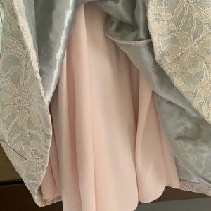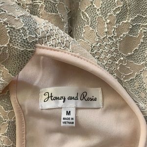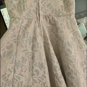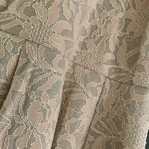 This is a champagne colored lace dress with a hint of sparkle. Fully lined and zips in back with two satin buttons at back of the neck. This is classy and so pretty! Perfect for date night, graduation, bridal shower or any summer event! It would even be a gorgeous wedding dress! This is out of my personal collection.