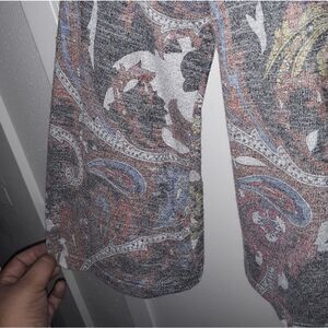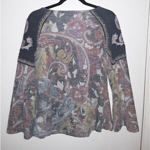 This is part of the 3x$20 Sale. Long sleeve top with fun abstract design print. It has beautiful embroidered work detail on the sleeves. Sleeves have a subtle flair as seen in picture #2. Fabric is very fresh. Pair it with your favorite jeans or denim shorts. It's pre-owned in perfect condition. The size says S but it runs big. It might fit maybe a size M. Please check measurements before buying.