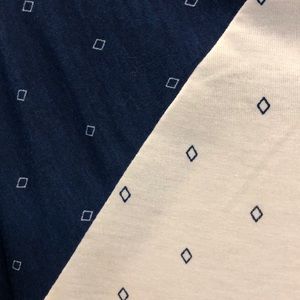 This 3/4 sleeve tee has a creamy white body with denim blue sleeves and a contrasting diamond pattern.