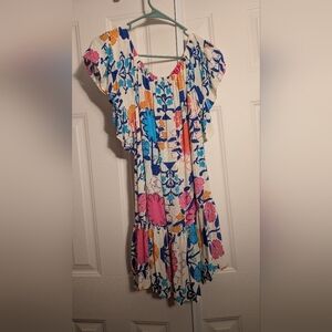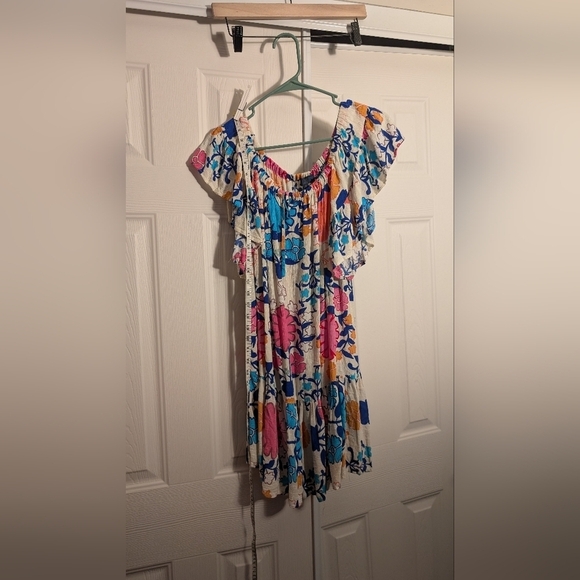 Embrace the essence of summer with this Rachel sundress, showcasing a delightful blend of blue and pink tones. The off-the-shoulder neckline and flutter cap sleeves create a breezy, resort-ready style, while the ruffled, smocked design offers a flattering fit. Ideal for casual outings, this dress exudes effortless charm and comfort.