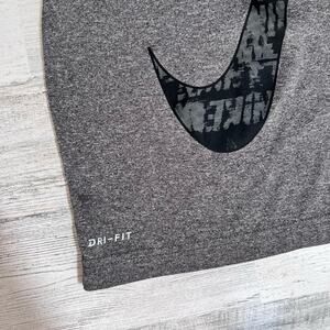 Nike boys athletic t-shirt in gray with large black swoosh logo. Features moisture-wicking Dri-FIT fabric, short sleeves, and lightweight comfort. Care tag removed.