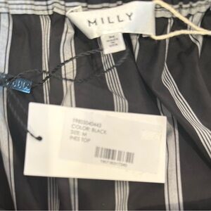 MRSP $325 Milly Ines blouse showcases a striking off-the-shoulder design with dramatic bell sleeves, accentuated by ruffled flounce details. The black and white vertical stripes add a touch of elegance, while the elasticized neckline ensures a comfortable fit. Perfect for a bohemian-inspired look, this blouse offers a flowing silhouette that exudes femininity. NWT, size M. 100% cotton.