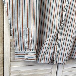 Rust and denim blue vertical stripes on lighter blue with denim blue on the inner collar and the flip cuffs