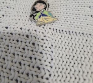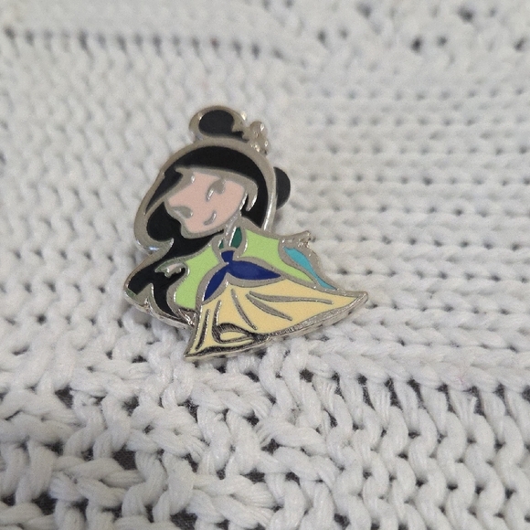 Charming Disney princess enamel pin with silver outline. Features black, yellow, blue, and green colors.41