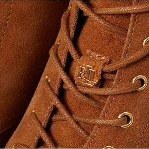 Elevate your shoe collection with these stylish Ralph Lauren Carlee booties. The ankle-length suede upper in a beautiful brown color is accented with a trendy almond toe shape and lace-up closure. The block heel measures 1.75 inches in height, providing both comfort and style.