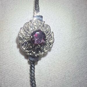 One of a kind silver herringbone chain bracelet with a beautiful center flower design with clear rhinestones and a dark red crystal. 8” long.