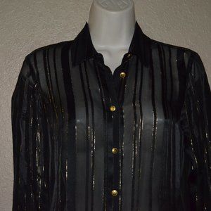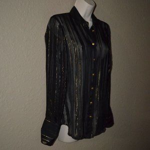 $325 Sz XS Frame Black Sheer Gold Metallic Pinstripes Long Sleeve Blouse