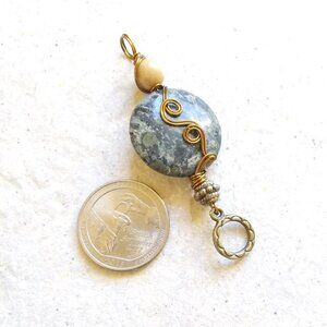 Clearing off odds & ends of my desk - and came across this large, dark green Kambaba Jasper flat coin bead. Topped it with a Natural Cream Jasper Bead - added bronze jewelry wire and some bronze beads and a ring charm - and voila! Created a beautiful, one-of-a-kind stacked beaded pendant, like no other. There is only one of these - and it can be yours if you love owning jewelry, that nobody else has!
