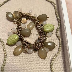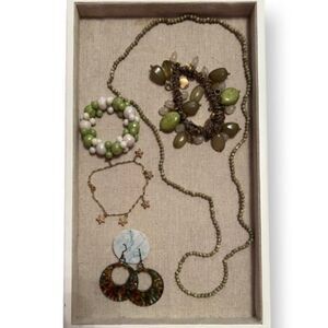 5 piece jewelry lot in green and gold tone. All wearable and in good condition. Some are vintage. 1 necklace, 3 bracelets, 1 pair of earrings.