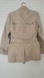 Water Resistant, double breasted, collared, belted, trench coat, two front hip pockets, adjustable wrist cuff bands, size small, tan color. small off color dot on back left shoulder. pointed to in last photo. no other signs of wear. flattering fit!