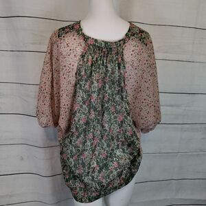 V neck. Pucker at chest and back. gathered sleeve. dolman sleeve.