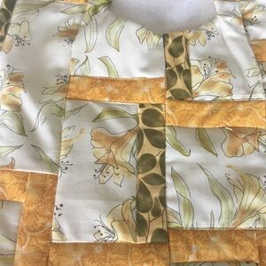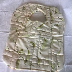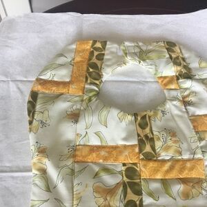 Yellow, green and creams floral prints on the front reverse to coordinating cream leaf print. This handmade bib is made from all new 100% cotton fabric in a smoke free home. Fits most babies through 18 months. Makes a great baby shower gift. Quilted with love.