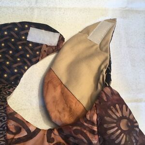 Brown, tans, and black batik prints reverse to two tone solid back in browns stripes. Handmade from all new 100% cotton fabric in a smoke free home. Velcro fastener. Fits most babies through 18 months. Great Baby Shower Gift. Quilted with love.