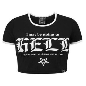 The “Hell Handbasket” tee features a round neckline, short sleeves, comfy fit & cropped length, with a pentagram graphic & iconic quote.