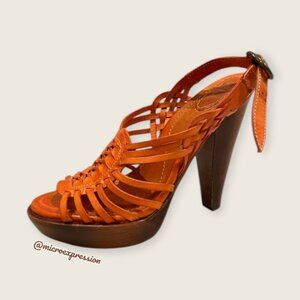 $329 Frye Joy Huarache Cognac Leather Sling Strappy Leather Sandal/Platform Heel