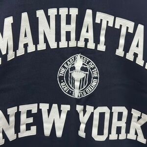 • Features: Crew neckline with ribbed trim. Drop shoulder fit. Soft fleece lining. Graphic “Manhattan New York” varsity lettering. Slightly cropped fit (modern style)
