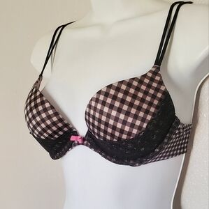 32C Victoria's Secret Very Sexy Push Up Gingham Checkered Black & Pink Lace Bra
