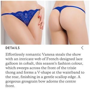 SET!! L'Agent by Agent Provocateur Cobalt Blue Bra & Thong. Vanessa unpadded demi bra in super unique cobalt blue lace. Vanessa Trixie thong panty in same fabric. The lacework on bob pieces is absolutely exquisite and the color is gorgeous. Choose your bra size, all panties are size large, bra is a size 32dd (not e). New with tags!