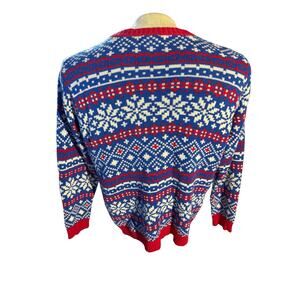 Festive and playful 33 Degrees men’s Christmas sweater, size Large. Features a bold blue, red, and white fair isle knit with an adorable gnome character front and center, complete with a 3D textured beard and tall felt hat. A perfect choice for ugly sweater parties, holiday gatherings, or just spreading seasonal cheer.