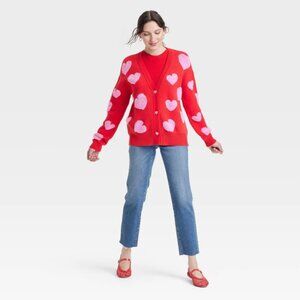 Cozy up in this vibrant red sweater featuring charming pink textured heart patterns from 33 degrees. Perfect for adding a playful touch to your wardrobe. Has adorable pink heart shaped buttons. Oversized fit.