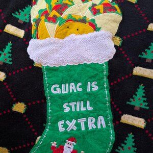 If youre into tacos, this is the ugly christmas sweater for you. Features burritos and tacos al over, an the text "Guac is still extra" with a shrugging santa on the front.