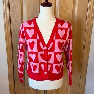 heart cardigan • red pink sweater • 33 Degrees cardigan • Valentine’s Day sweater • graphic heart print • postage stamp pattern • cozy knit cardigan • women’s size small • rayon nylon blend • cute aesthetic sweater • y2k vibes • cropped cardigan • button front knit