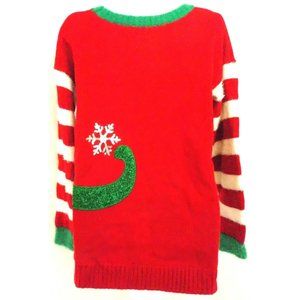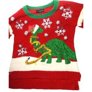 Sweater is red with silver sequins shaped like snowflakes. There is Green Dinosaur with garland and Christmas lights wrapped around its body. Dinosaur is wearing a Santa hat. There are white and silver balls spread out randomly on the sweater also.