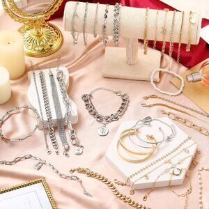 Fashion Set: 9 stylish sets of gold and silver bracelets for women, featuring a total of 33 stacking bracelets with different designs like satellite, mirror, Figaro, and Cuba. Perfect for mixing and matching or wearing alone for a chic look.