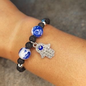 💙Carefully handcrafted with authentic lava beads, blue lace agate natural stone beads and a fatima evil eye rhinestone charm💙