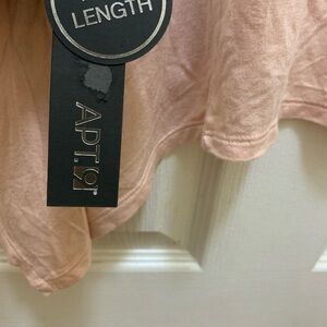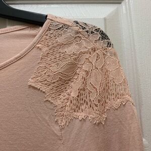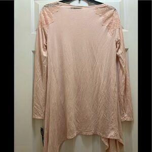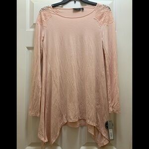 Apt. 9 long sleeved blush pink tunic blouse with see through lace shoulder. This top is a great length to wear with your favorite leggings and is super soft.