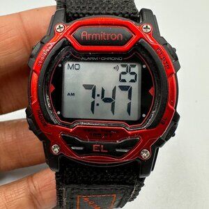 Armitron Digital Watch Men Black Red Round Case Nylon Strap Band New Battery